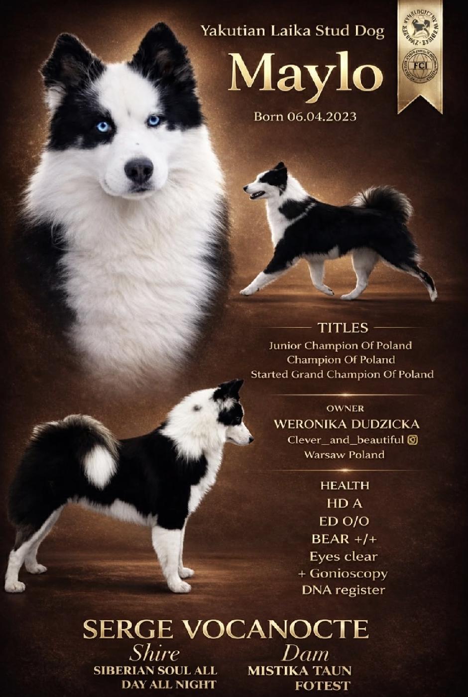 Проверки здоровьяHD-A/A, ED-0/0ТитулыЧемпион Польши, Юный Чемпион ПольшиДругие достиженияBEAR +/+ , DNA TESTE , EYES CLEAR + GONIO, STUD DOGКоэффициэнт инбридинга0%Родословная